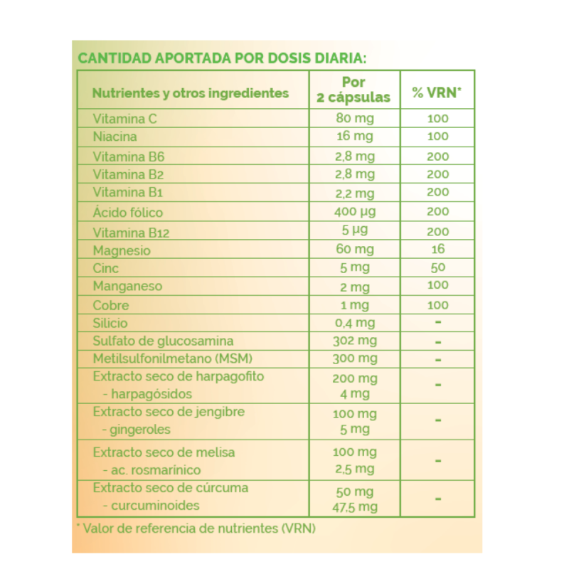 Ingredientes: Glucosamina magnesio, Metilsulfonilmetano (MSM), harpagofito, jengibre, melisa, vitamina C, cúrcuma, ácido silícico, manganeso, niacina, zinc, vitamina B6, vitamina B2, vitamina B1, cobre, vitamina B12 y ácido fólico.